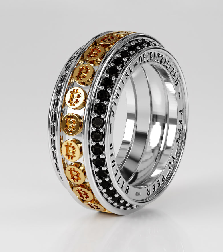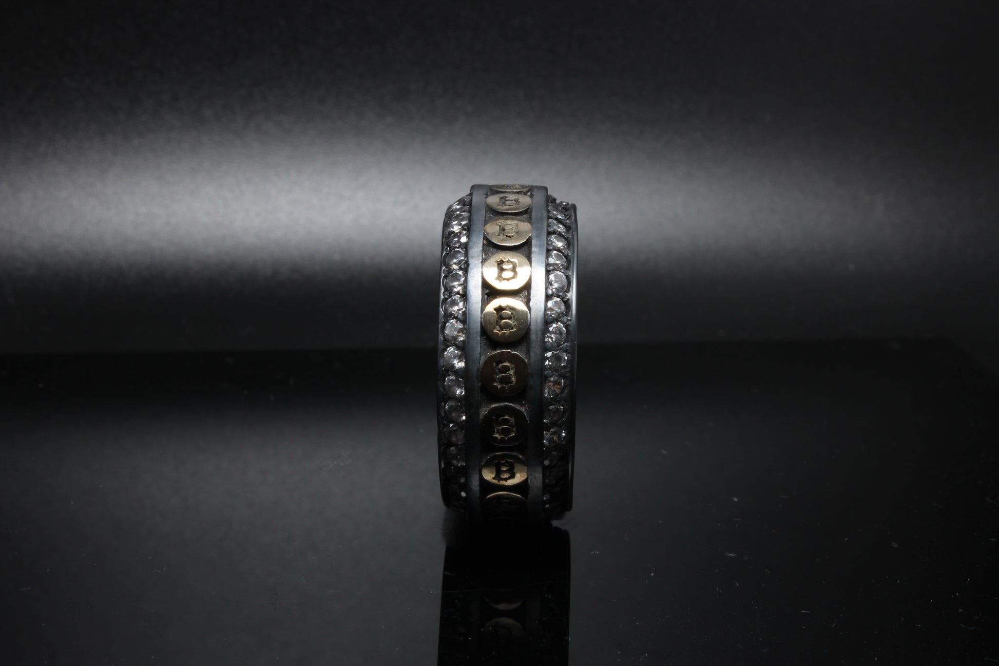 The Bitcoin Band Ring is no exception, made from a choice of 18ct yellow, white, rose gold or silver featuring a customisable ring face (in this Bitcoin logo going around the ring) surrounded by set black diamonds.