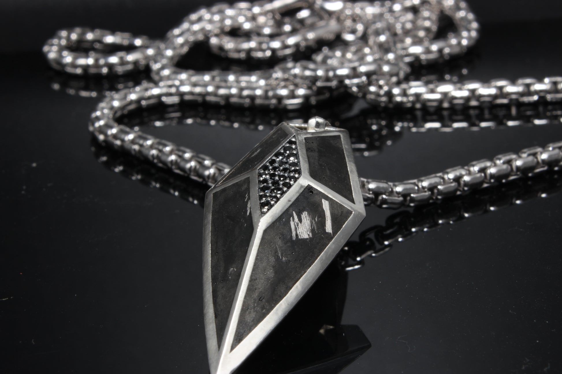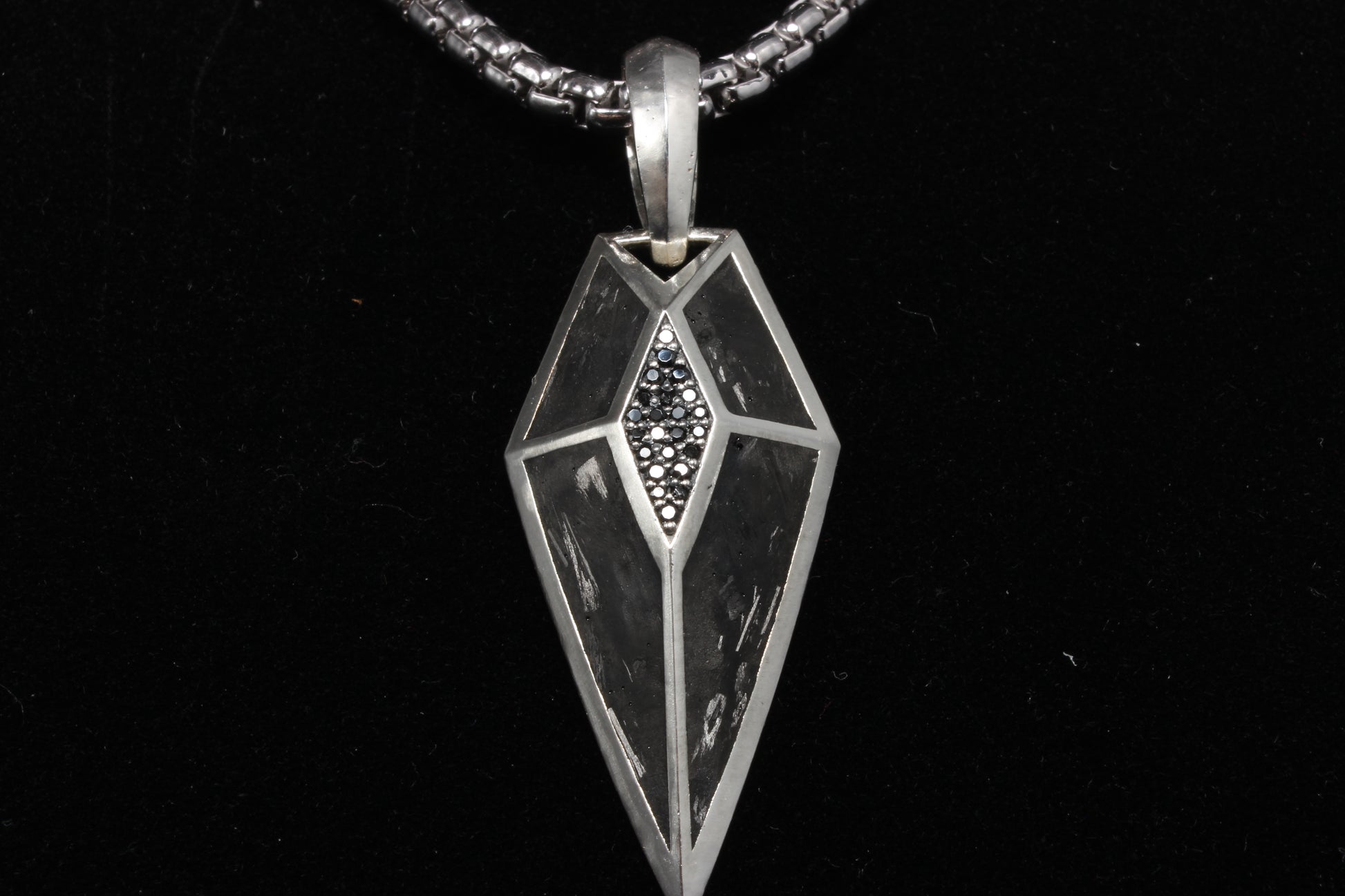 This Stunning Platinum pendant blends a unique mix of shape, black diamonds and forged carbon giving you a statement piece on the neck.