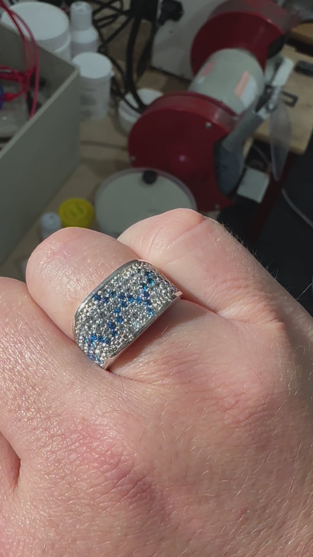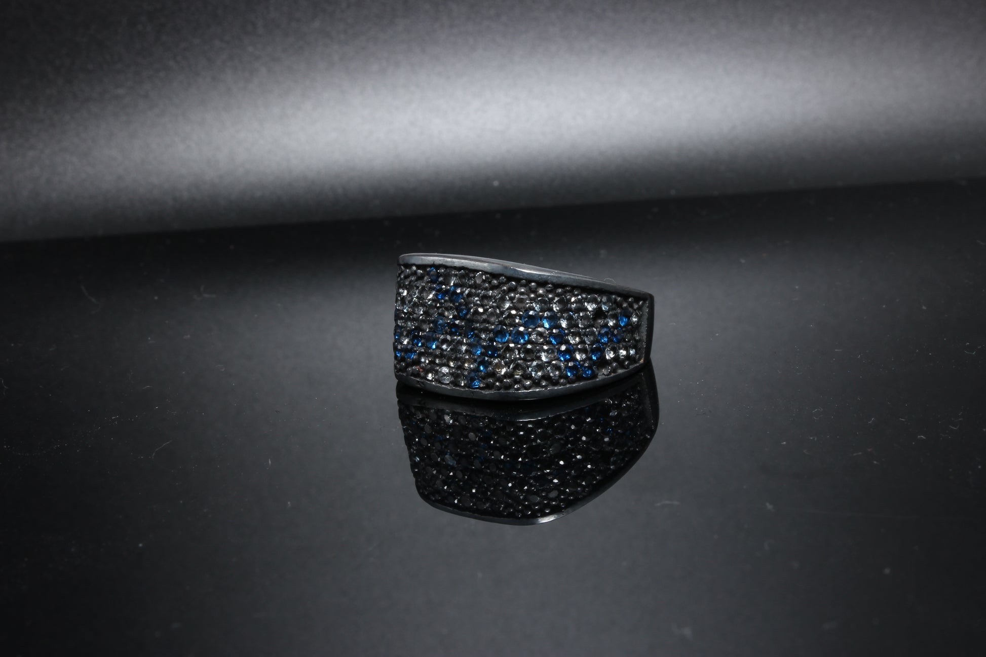 The unique ring features diamonds, aquamarine and blue spinel to create a flash of blue running the length of the ring. Images also show ring after black rhodium plating.