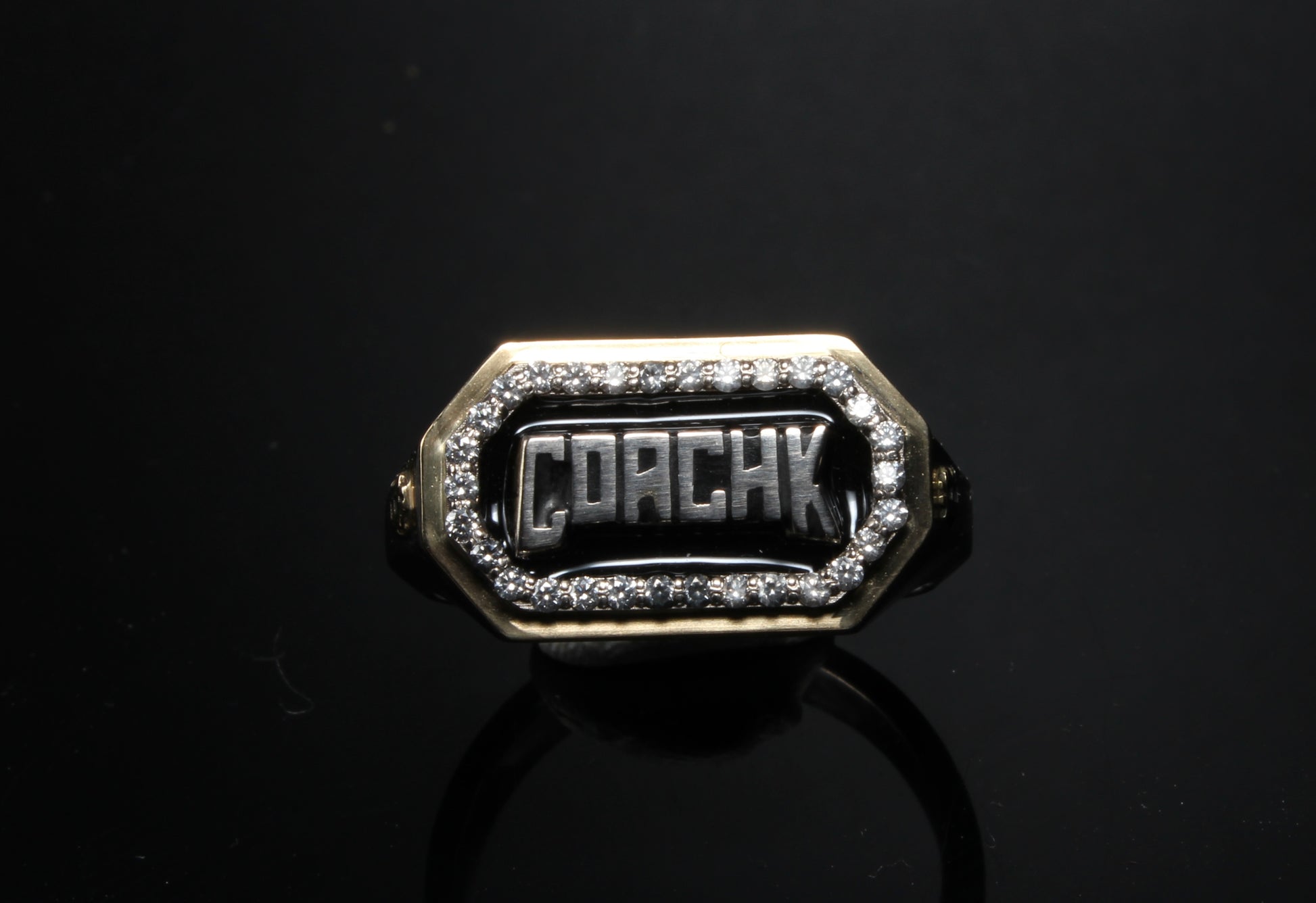 This brand ring can feature your brand or personal name surrounded by black enamel. Made from a choice of 18ct yellow, white or rose gold surrounded by pavé set diamonds and your choice of side engraving (in this case Bitcoin logo) making the ring totally personalised to you.