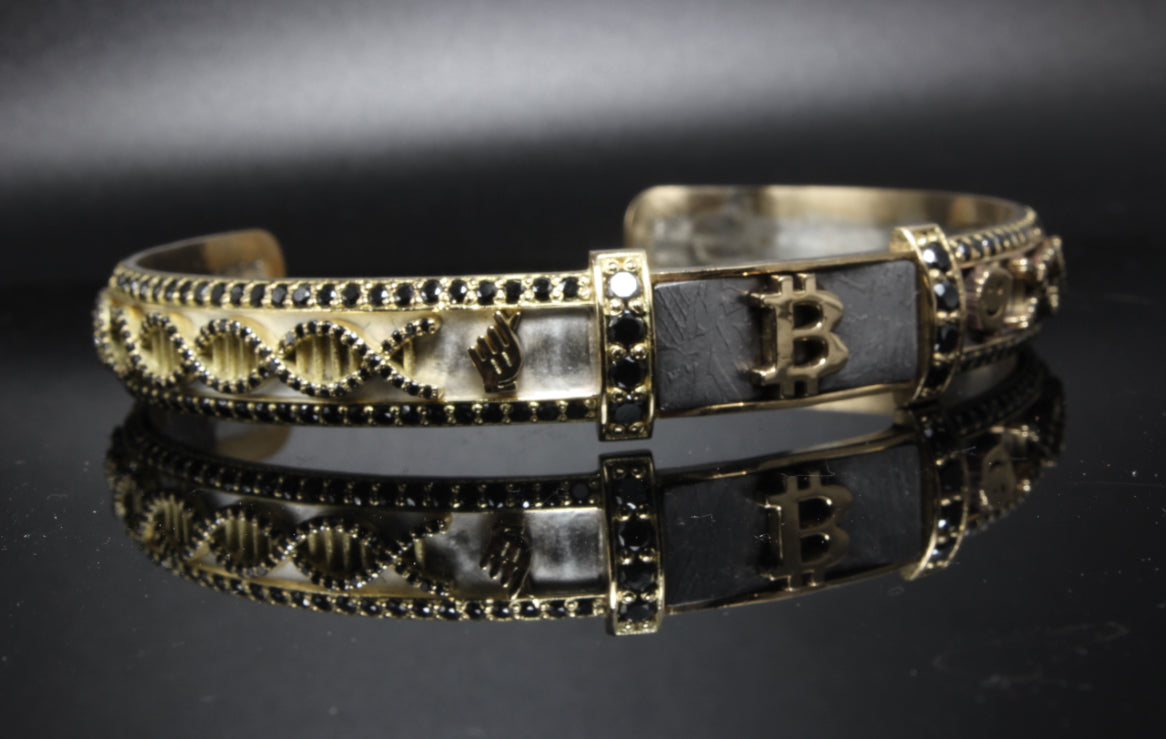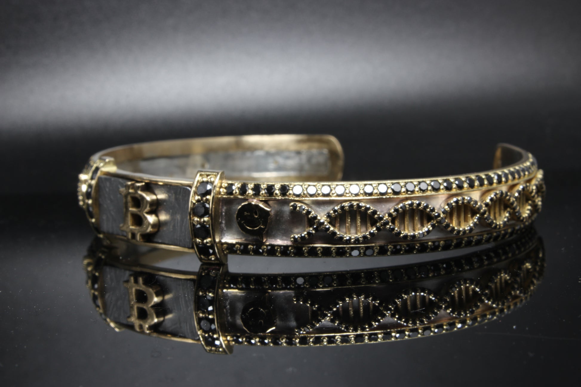 It's In My DNA Cuff is no exception, made from a mix of 18ct Yellow Gold & 18ct White gold with complementing black and white diamonds. Front and centre is the Bitcoin logo surrounded by meteorite. Each side of the cuff has custom logo's (in this case PAID & Common Wealth) and DNA strands. This cuff is totally customisable to auit your specifications.