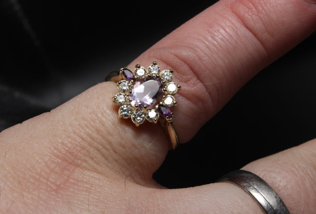 A Stunning 18ct Yellow gold ring which houses a centre Lavender Amethyst 7.5x5.5mm surrounded by smaller diamonds and two marquise dark amethysts.