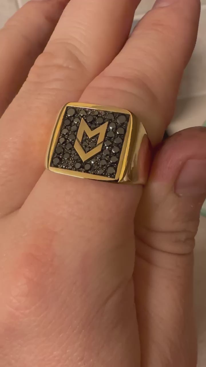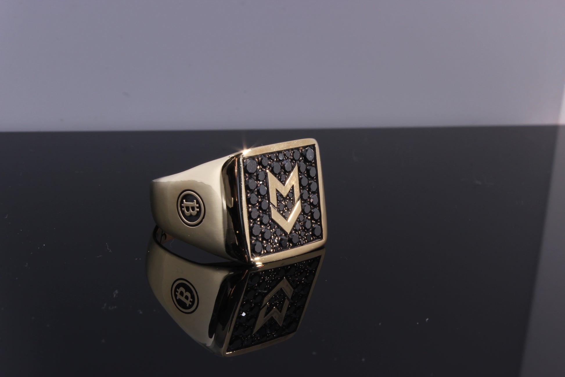 The Venture ring is no exception, made from a choice of 18ct yellow, white or rose gold featuring a customisable ring face (in this case initials) surrounded by pavé set black diamonds and your choice of side engraving (in this case Bitcoin logo) making the ring totally personalised to you.